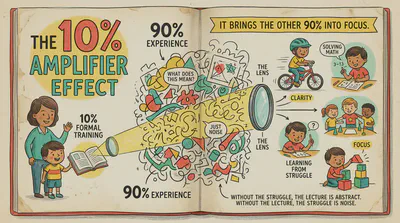 Researchers at the Center for Creative Leadership describe this as an “amplifier effect.” Formal training is small in volume but disproportionate in impact — not as a foundation, but as a catalyst. It clarifies what experience has already half-taught. Without the struggle, the lecture is abstract. Without the lecture, the struggle is noise. The 10% is not the least important slice. It is the lens that brings the other 90% into focus.
