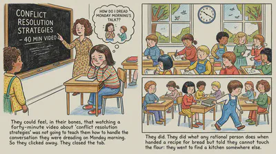And those completion rates — the 5% to 15% that the industry treats as normal — are not the disease. They are the fever. The body rejecting something it knows is wrong. Learners are not lazy. They are not distracted. Many never intended to finish — they were browsing, sampling. But those who did intend to finish and still dropped out? They were bored. They could feel, in their bones, that watching a forty-minute video about “conflict resolution strategies” was not going to teach them how to handle the conversation they were dreading on Monday morning. So they clicked away. They closed the tab. They did what any rational person does when handed a recipe for bread but told they cannot touch the flour: they went to find a kitchen somewhere else.