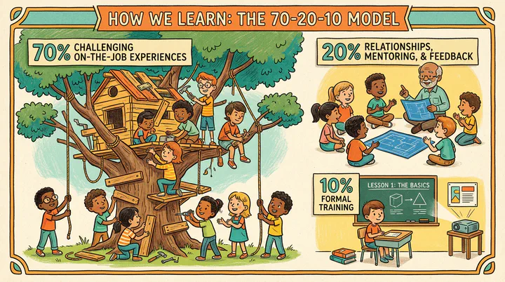 In the mid-1990s, Michael Lombardo and Robert Eichinger — building on research they’d conducted with Morgan McCall at the Center for Creative Leadership in the 1980s — put a number on something most of us sense but rarely act on. They surveyed roughly two hundred successful executives about where their capabilities actually came from. The answer was a ratio: 70% of meaningful learning comes from challenging on-the-job experiences. 20% comes from relationships, mentoring, and feedback. And just 10% comes from formal training — the courses, the workshops, the carefully produced slide decks.