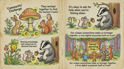 This is where most e-learning platforms fail the 20% entirely. They bolt on a discussion board the way a builder might scatter mushrooms on a concrete floor and call it an ecosystem. But mycelium needs the right conditions: moisture, organic matter, root systems to connect to. Digital social learning needs the equivalent — shared challenges that create genuine need for each other, structures that make reaching out easier than going it alone, and enough psychological safety to admit when you’re the struggling tree that needs nutrients sent your way.